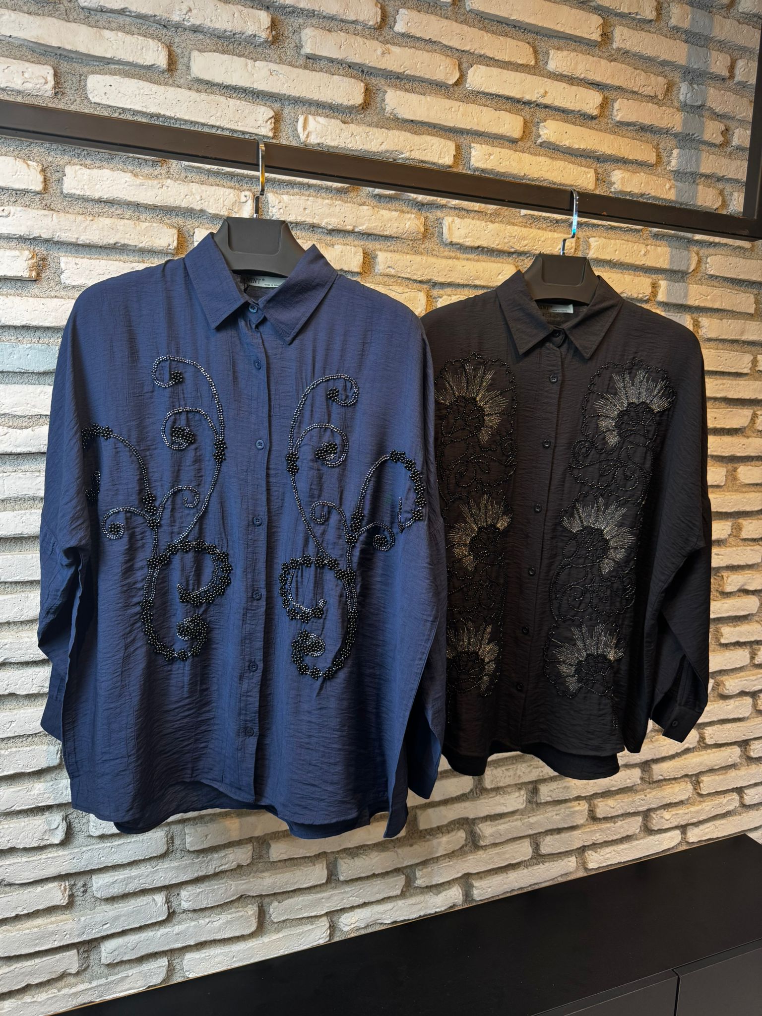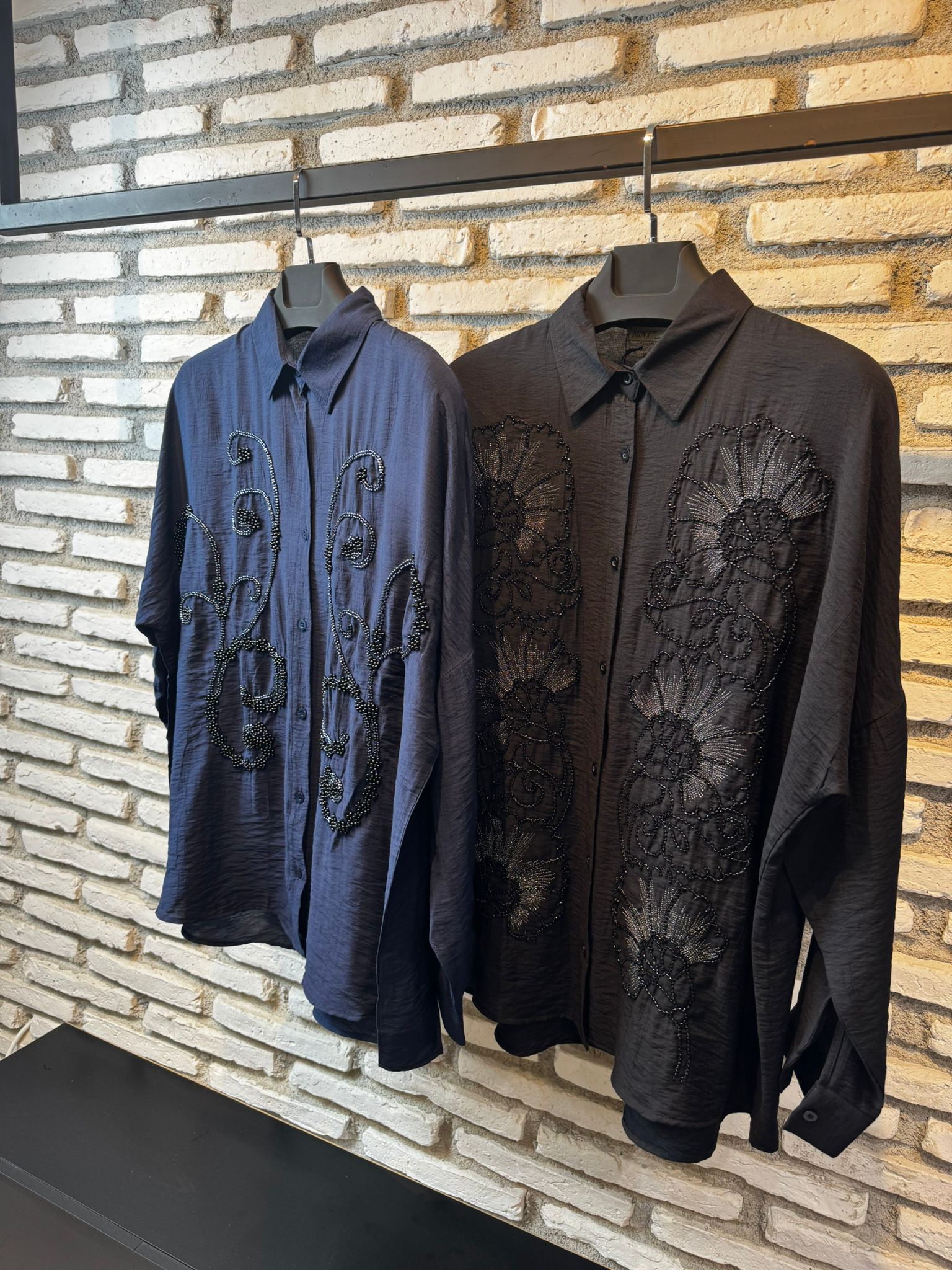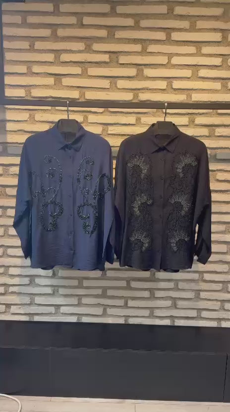Zarafeti ve modern kesimi bir araya getiren bu gömlek, el işçiliği zarafetindeki boncuk detaylarıyla sıradanlıktan uzak, asil bir görünüm sunar.